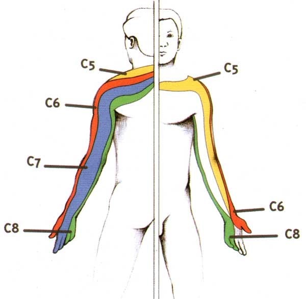 Chaque nerf va couvrir un territoire de peau et contrôler certains muscles du corps. Par exemple, référons-nous à l’image ci-dessus. Si une personne a un problème mineur au cou, mais suffisamment important pour causer une inflammation du nerf C6, celui-ci et les structures avec lesquelles il connecte vont devenir hypersensibles. Remarquons que le territoire C6 passe par l’épaule, puis à l’épicondyle du coude, avant de terminer au pouce.