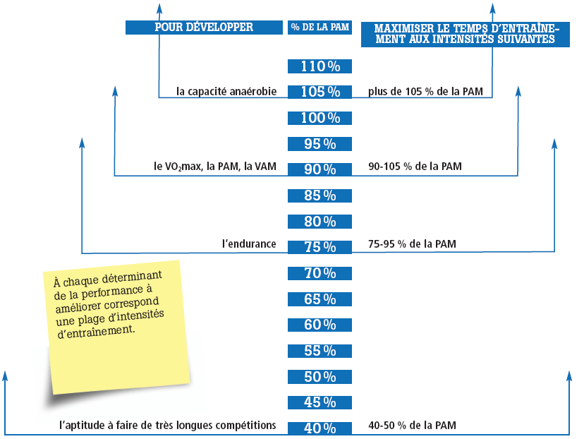 Les séances varieront donc en intensité en fonction du temps d’effort. Pour une séance de VAM courte (30 à 60 secondes), on essaiera de courir entre 100 % et 110 % de sa VAM. Pour une séance de VAM moyenne à longue (60 à 180 secondes) on visera plutôt entre 95 % et 100 %. Le but est d’apprendre à repousser la production d’acide lactique et de supporter son apparition. De plus, toutes les séances de VAM permettent d’améliorer son efficacité de mouvement, ce qui réduit également le coût métabolique de la course.